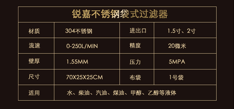 銳嘉吊環式高壓液體過濾器是一種新型的袋式過濾器,可過濾水、柴油、酒精等各種液體,布袋統一采用1號,袋如有特殊需求,可聯系我們定做。